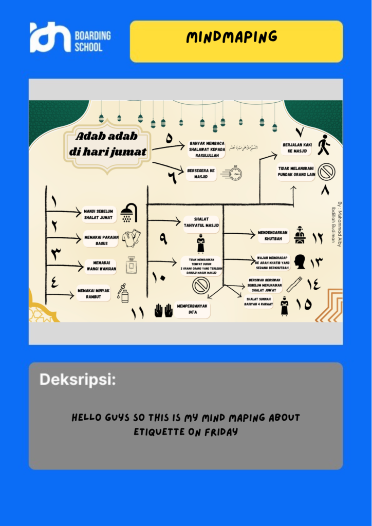 Tinggalkan Komentar / Oleh albybudiman / 16 September 2024 " Mind Maping " Assalamualaikum, hello guys, back with me again, this time I will show my task, namely my task is minmaping, so my mindmaping has the theme of etiquette on Fridays and you can do it too