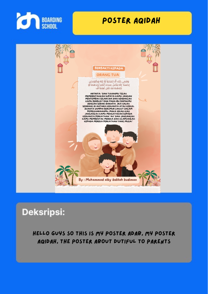 Tinggalkan Komentar / Oleh albybudiman / 16 September 2024 " Poster aqidah " Assalamualaikum, hello guys, back with me again this time I will show my assignment, namely an aqidah poster, and my aqidah poster has the theme of being filial to parents. I made this poster with the Canva application