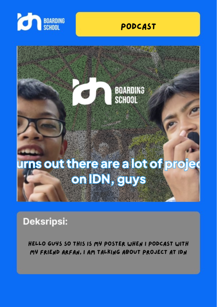 Tinggalkan Komentar / Oleh albybudiman / 7 November 2024 Podcast Assalamualaikum, hallo guys this time next to the photo there are me and my friend, Arfan, on the poster I'm doing a podcast I'm talking about assignments at IDN