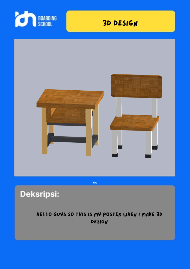 asssalamualaikum, hello everyone, back again with my poster, so in this poster I made 3 designs, I made the 3D design using the spline application, and then in there i make a table and chair for school, i make that only 1 hours okay, maybe that's all, see you again in the next poster