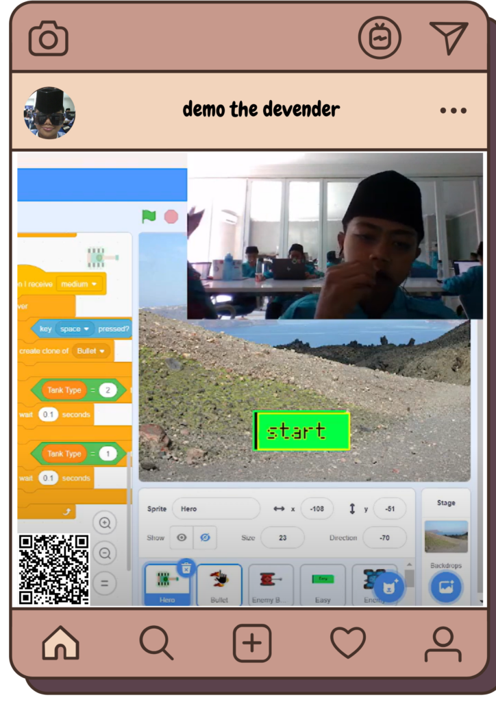 so this is my scratch game so this is "the devender" game so we are told to fight tanks so we have to defeat a lot of enemy tanks and after finishing the enemy tank the boss will come and if the boss is defeated you can win. If you want the game, scan the QR!